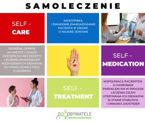 Samoleczenie może przybierać różne formy, od szeroko rozumianego self-care, czyli samoopieki i świadomego zaangażowania pacjenta w dbanie o własne zdrowie, przez najbardziej utożsamiane z polski terminem – self-medication. To z kolei doraźne, oparte na wiedzy i lekach dostępnych bez recepty leczenie samodzielnie rozpoznanych objawów do momentu konsultacji z lekarzem. Kolejnym elementem samoleczenia jest też niedoceniany self-treatment, czyli współpraca pacjentów z chorobami przewlekłymi w procesie leczenia, która pomaga utrzymać ich objawy w stanie stabilnym.